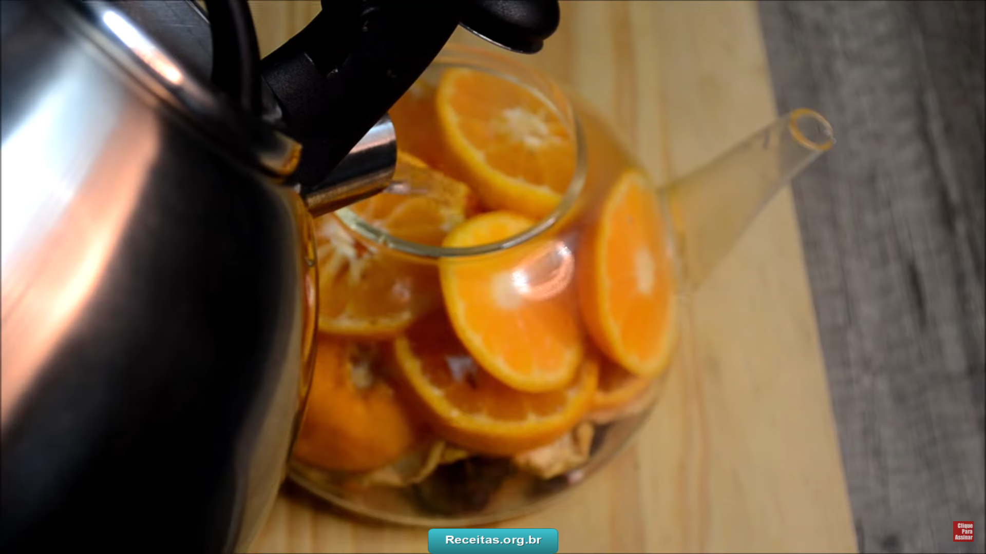 • Em um bule, leiteira ou panela coloque os ingredientes desidratados, as fatias de tangerina por cima e em seguida a água fervente.
